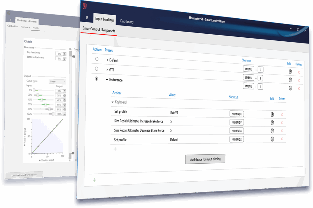 SmartControl is a configuration tool which allows you to map output curves, deadzones and set required input force for your products. Settings of (multiple) products can be stored into profiles which allows you to make tailor-made settings for specific cars or simulator software. It is also used to calibrate products if needed.